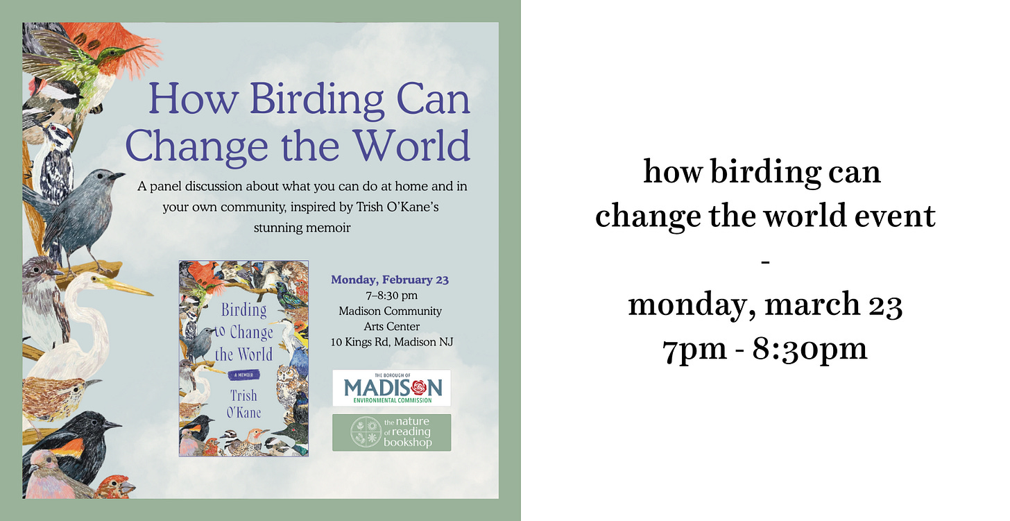 After rescheduling a month ago because of a snowstorm, it’s finally here: our How Birding Can Change the World event! Join us tomorrow evening at the Madison Community Arts Center for a panelist discussion featuring local birding experts with presentations inspired by one of our most favorite books, Birding to Change the World by Trish O’Kane. You can order a copy here to read here before the event or purchase a copy at our pop-up the night of the talk. The event is free and open to all, just please register here in advance so we can get a final headcount!