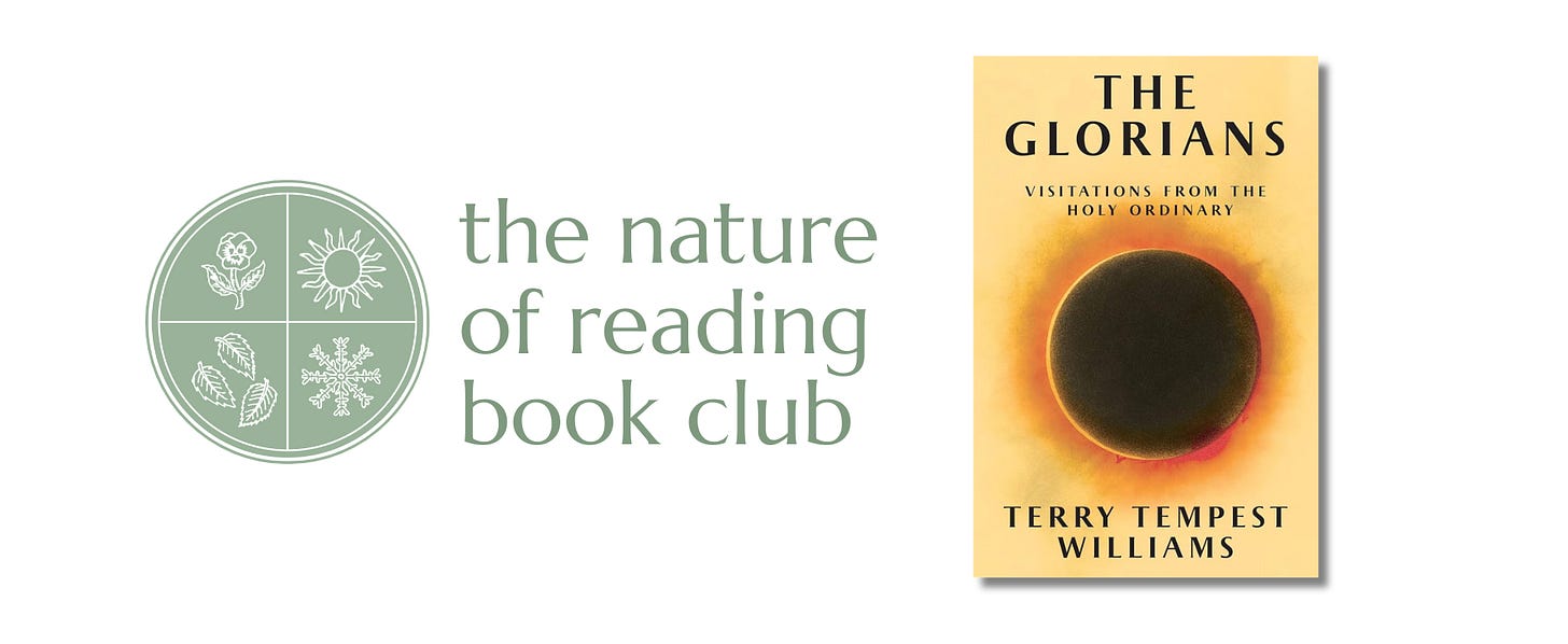 This month we’re reading The Glorians: Visitations from the Holy Ordinary by Terry Tempest Williams. When the world seems more uncertain than ever, we need moments of devoted attention that sustain us in the deepest ways. Terry Tempest Williams introduces us to the Glorians: “ordinary, often overlooked presences—animal, plant, memory, moment—that reveal our shared vulnerability and interconnectedness with the natural world. The Glorians can be as small as an ant ferrying a coyote willow blossom to its queen or as commonplace as the night sky. But what they can collectively show us—about the radical act of attending to beauty and carrying forward against all odds—is immense.” We hope you can join us to discuss this beautiful book and the encounters with Glorians that we’ve had in our own lives.