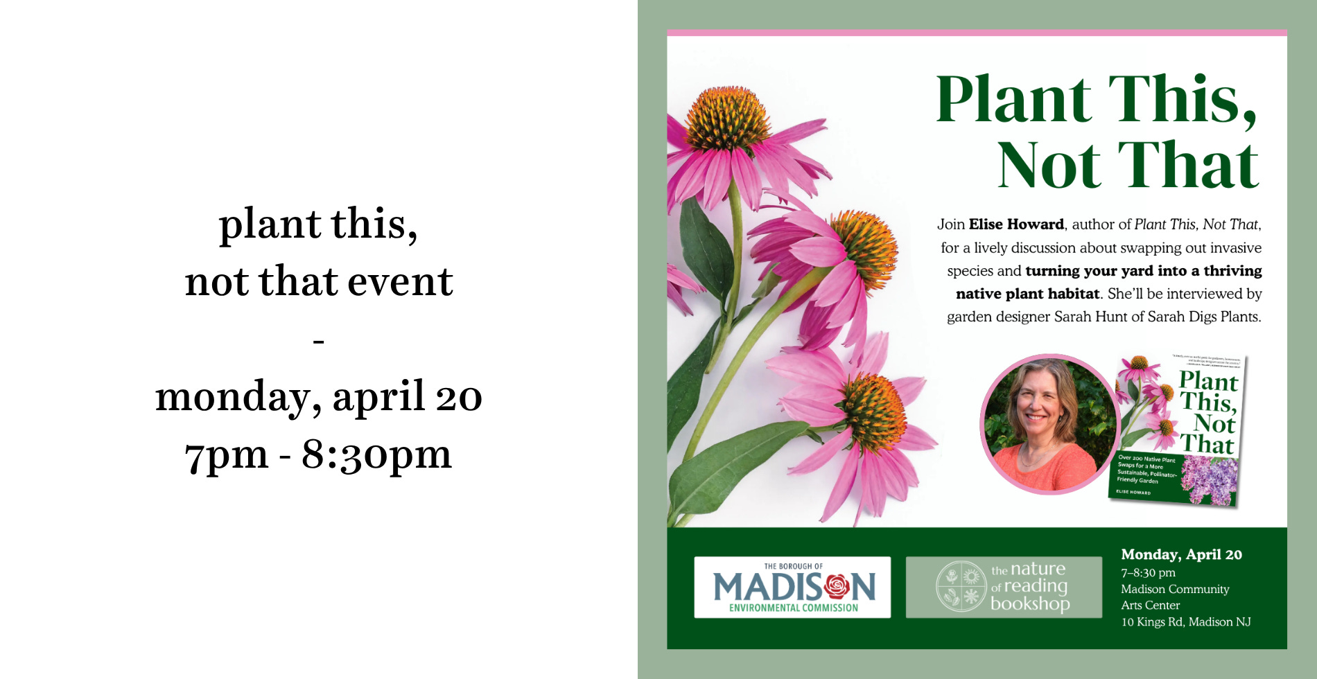 The Madison Environmental Commission and I are also very excited to announce the next event in our Nature Lover’s Speaker Series: we’ll be featuring the book Plant This, Not That: Over 200 Native Plant Swaps for a Sustainable, Pollinator-Friendly Garden. Besides discussing one of our favorite topics (native plants) we’re also so lucky to be joined by the author, Elise Howard, who will share her vast knowledge in an interview with the wonderful Sarah Hunt of Sarah Digs Plants. You can purchase a copy here to read before the event, or you can get a copy at our pop-up the night of the talk. The event is free and open to all, just please register here in advance so we know how many people to expect!
