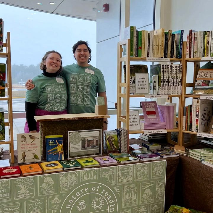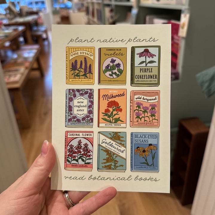 For years I had wanted to draw a design with nine book covers as the focus, ideally with native plants or other locally relevant nature elements. In the weeks leading up to the conference, I spent hours drawing out the native plants, moving between Procreate on my iPad and Adobe Illustrator on my computer. I also consulted with several friends of the shop who are native plant experts, to come up with the nine native plants that ended up in the final design. I get a bit crazy when it comes to my own art/graphic design, but finally, it all came together!