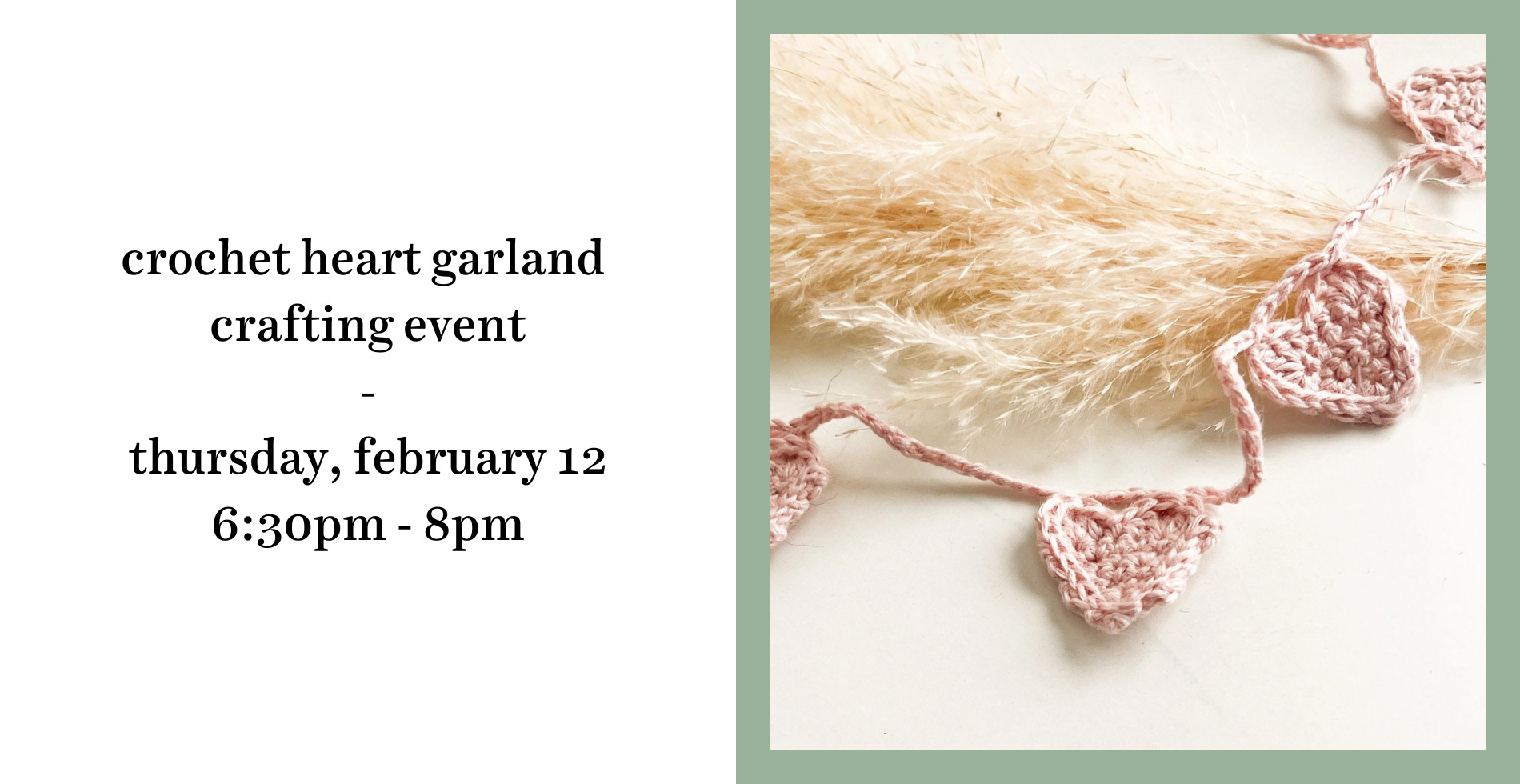 We’re back with another crafting event for next month! This month we’ll have our first ever crochet event—we’ll be making this lovely mini heart garland, which makes a perfect decoration for Valentine’s Day and beyond. The kit even comes with a little box for gifting so you can give a garland to a loved one! We’d love to see you there next month.