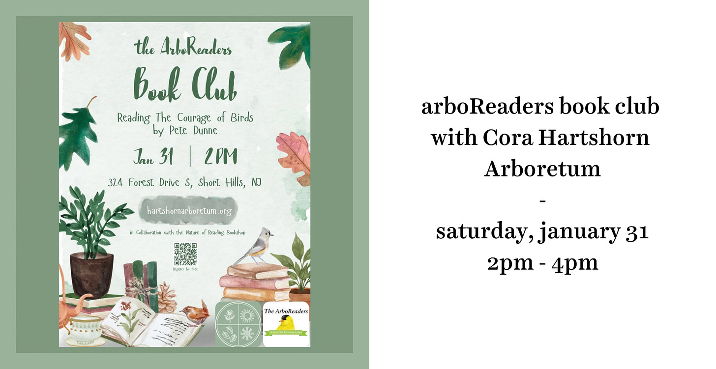 Next weekend is the first meeting in our exciting collaboration with Cora Hartshorn Arboretum & Bird Sanctuary—a new book club called The ArboReaders (could they have chosen a more perfect name?). Join us each season to read a nature book and have the coziest of discussions at the beautiful Arboretum. For the winter season, we’re reading The Courage of Birds: And the Often Surprising Ways in Which They Survive Winter by Pete Dunne. You can pick up a copy of the book at the shop if you’d like to buy one, but the event is free and open to all! Sign up here.