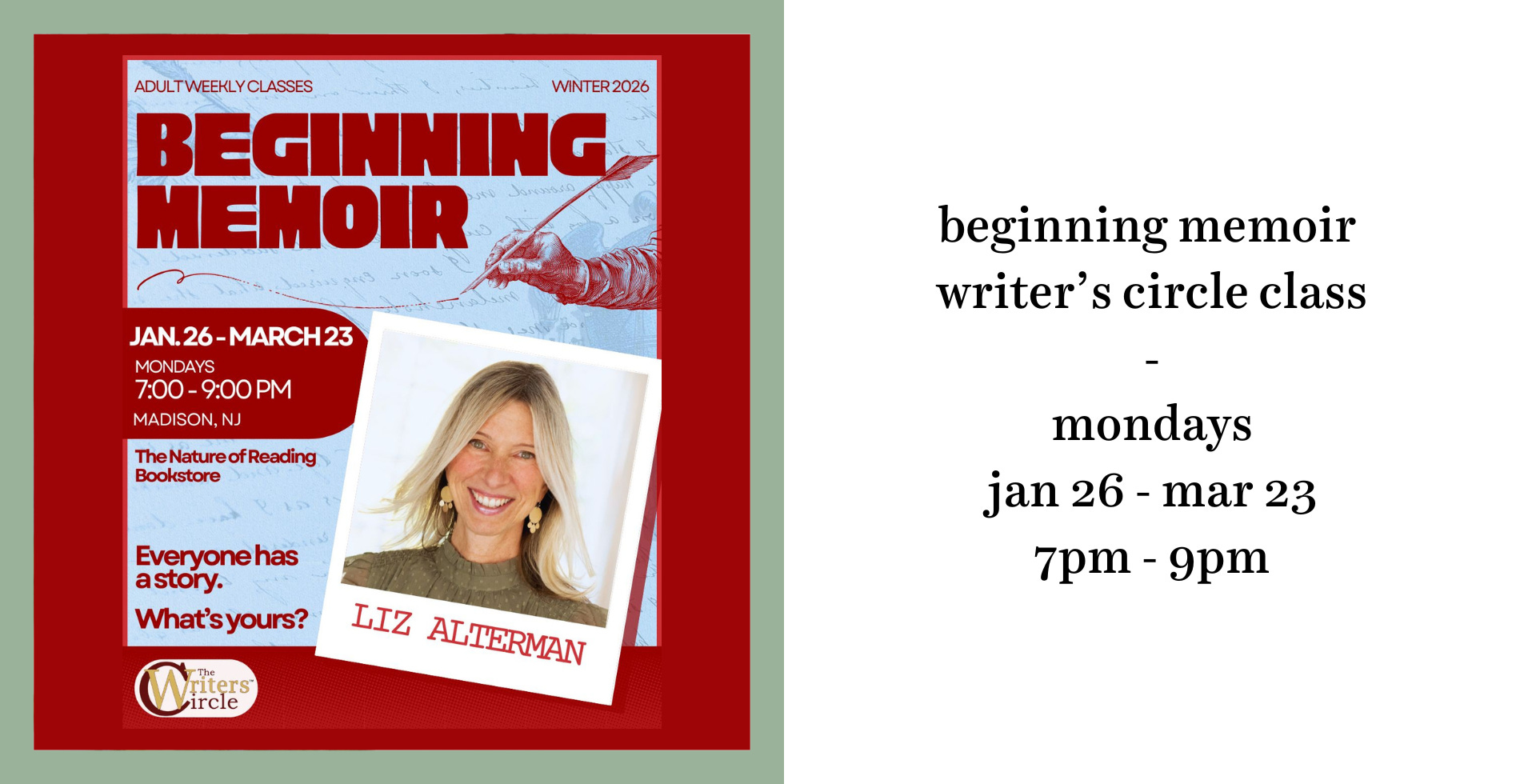 We’re pleased to be hosting another Beginning Memoir class this winter led by the lovely author Liz Alterman. From The Writer’s Circle website: “Every person has a story. What is yours? Memoir writing is the process of adapting your true-life experiences in a way that reads like fiction. Whether your writing goal is personal, in essay form, or an entire book, this class will give you the tools you need to develop and strengthen your writing process. Through prompts, supportive round-table discussions, and constructive critique, we will explore how to structure stories, develop the skills that bring them to life, and show how to enhance your writing.” Sign up here to join the class—it will be meeting at the shop every Monday evening.