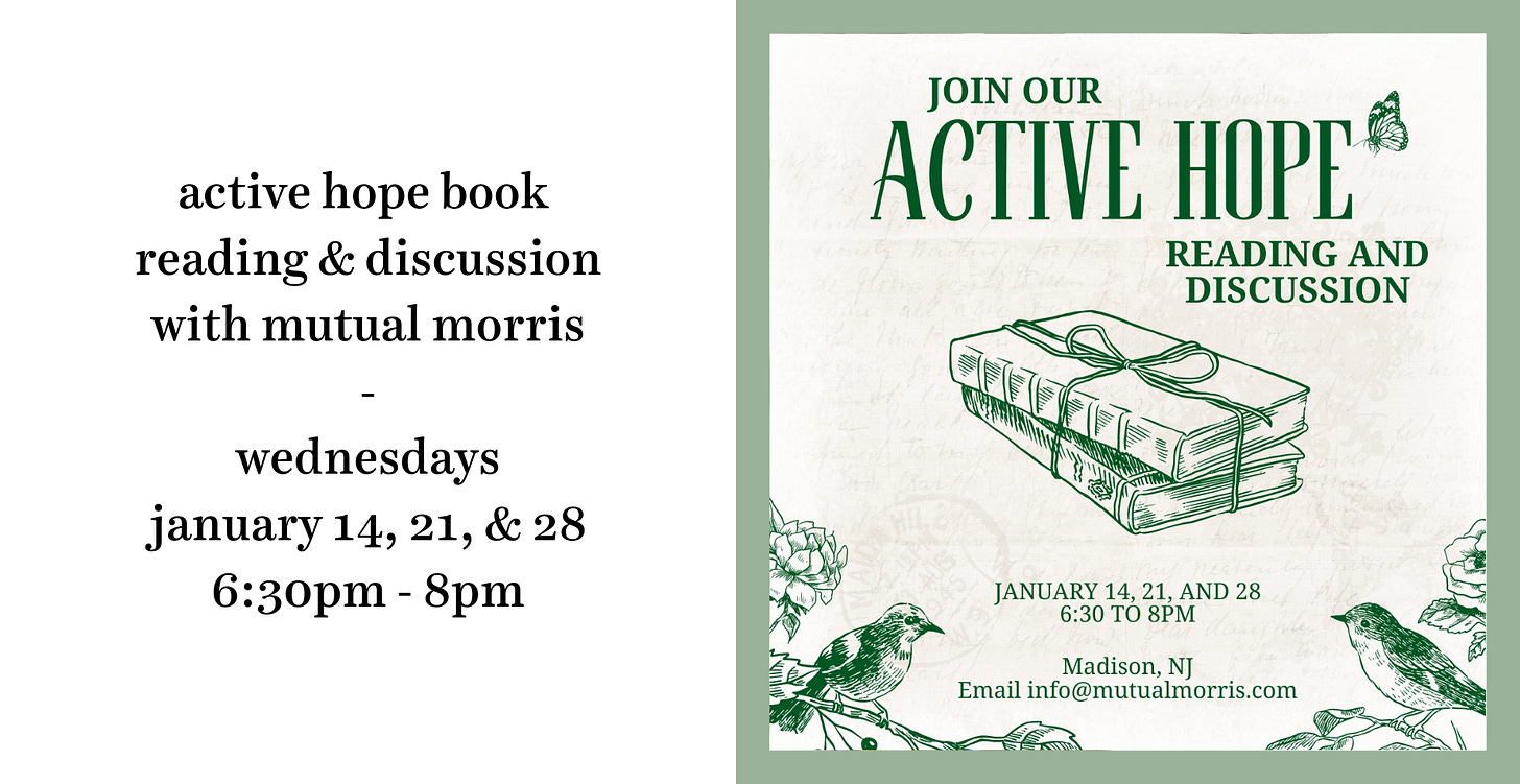 Even if you weren’t able to make it last two meetings, we’d still absolutely love to see you this Wednesday at Mutual Morris’s next discussion of Active Hope, Part 3. While the vastness of the planetary polycrisis can often be overwhelming, working together to support the people closest to you in your community is one of the best ways to be able to weather any storm and one of the most effective ways to make a difference in the climate crisis. Learn more about mutual aid and how to turn eco-anxiety into active hope with us this month. These events are free and open to all—just reply to this email if you’d like to join us so we can get an estimate of attendees beforehand. We hope to see you there!